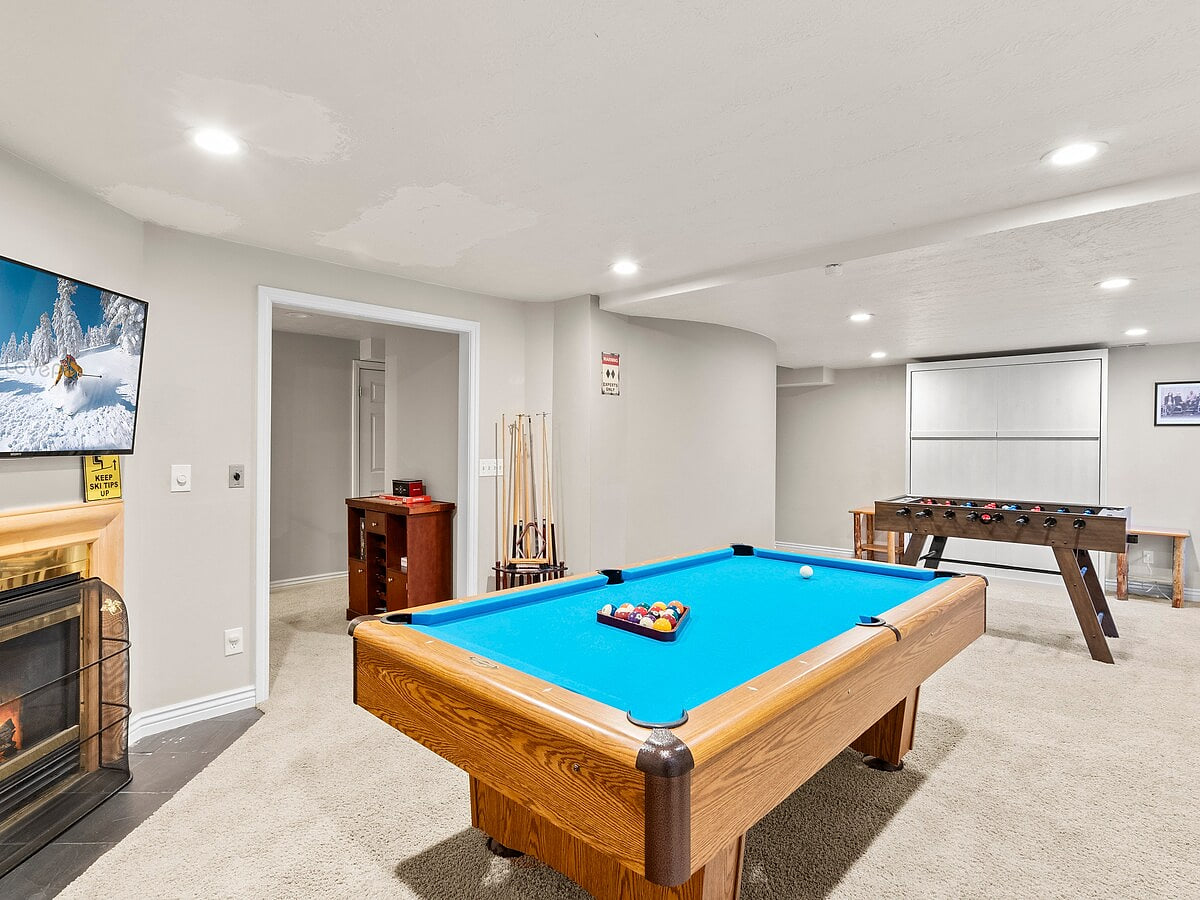 Head downstairs to the game zone—complete with a pool table, foosball, board games, and a queen Murphy bed for extra guests.